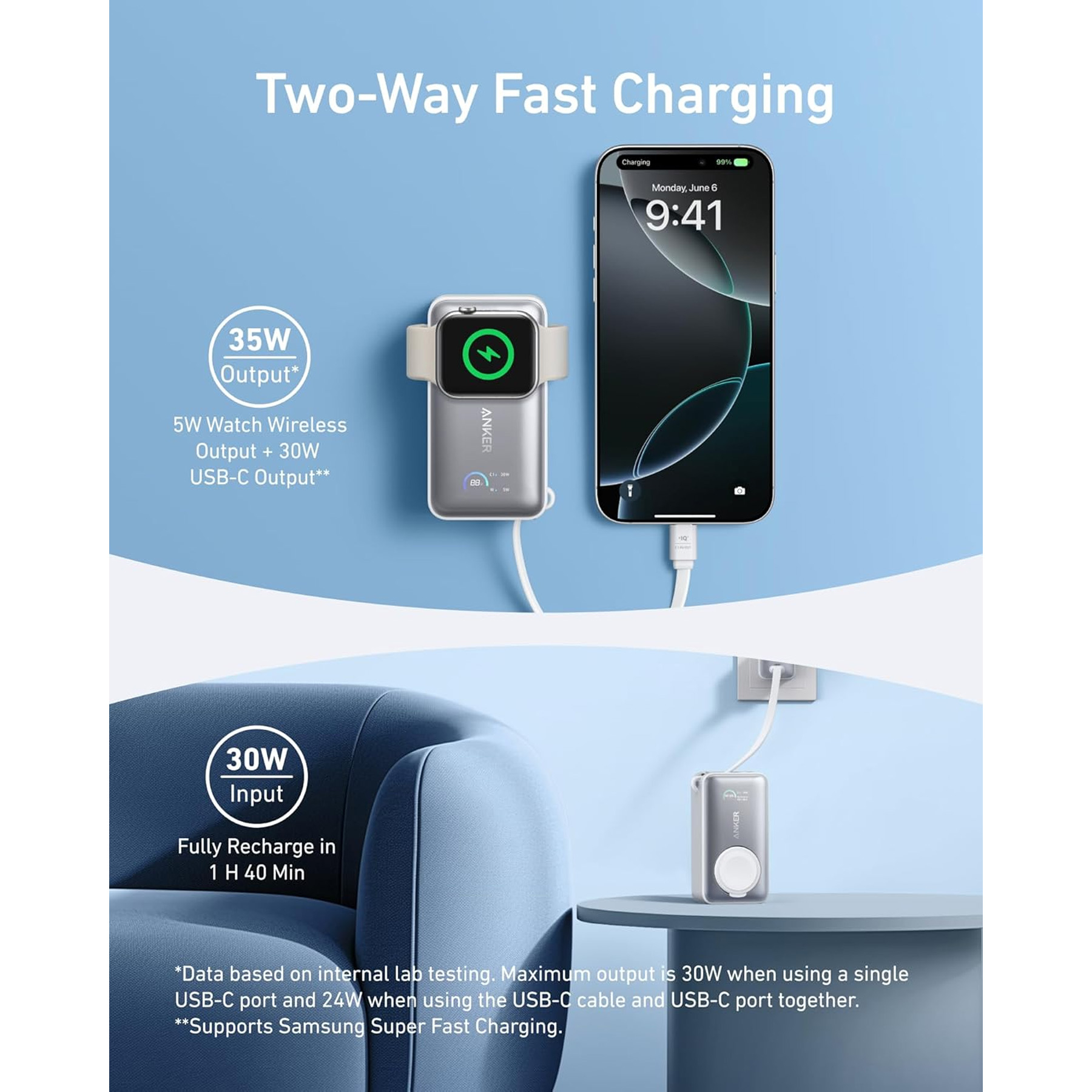 پشتیبانی از فناوری شارژ سریع, توان خروجی 30 وات از طریق USB-C و 5 وات از طریق شارژر بی سیم, دارای نمایشگر هوشمند شارژ دیجیتالی با جزئیات شارژ